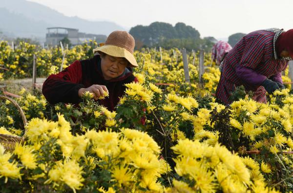 日前,周潭镇七井村启航菊花基地200亩金丝皇菊、黄山贡菊竞相绽放,村民们忙着采收,实现家门口就业增收。(左文)