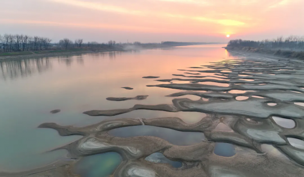 12月29日,受长江枯水期水位下降影响,郊区大通镇鹊江段露出大面积滩涂。夕阳时分,滩涂的自然肌理与水洼在暖光中形成“大地指纹”般的独特景观,水鸟栖息、江天共色,构成了冬日长江边的诗意画面。(陈磊)
